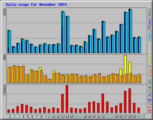 | Day | Hits | Files | Pages | Visits | Sites | kB F | kB In | kB Out | ||||||||